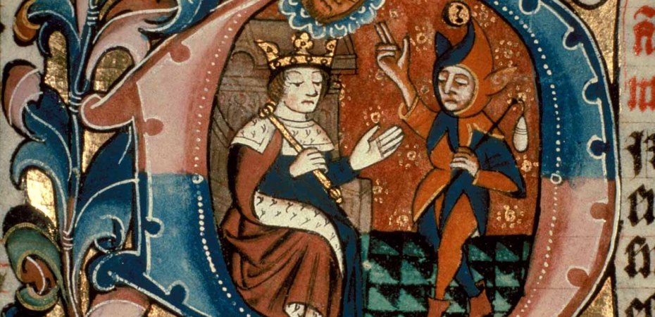 This symbolism was reflected in his costume as an inversion of royal power: motley crown, grinning sceptre, and a riot of unrestrained fashion. Clearly foolish, he was not a threat to ambition and power.